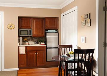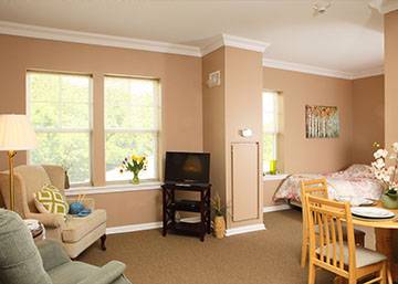 Our senior living community features home-like studio, one-bedroom, and two-bedroom apartments, along with spacious common areas and landscaped grounds.